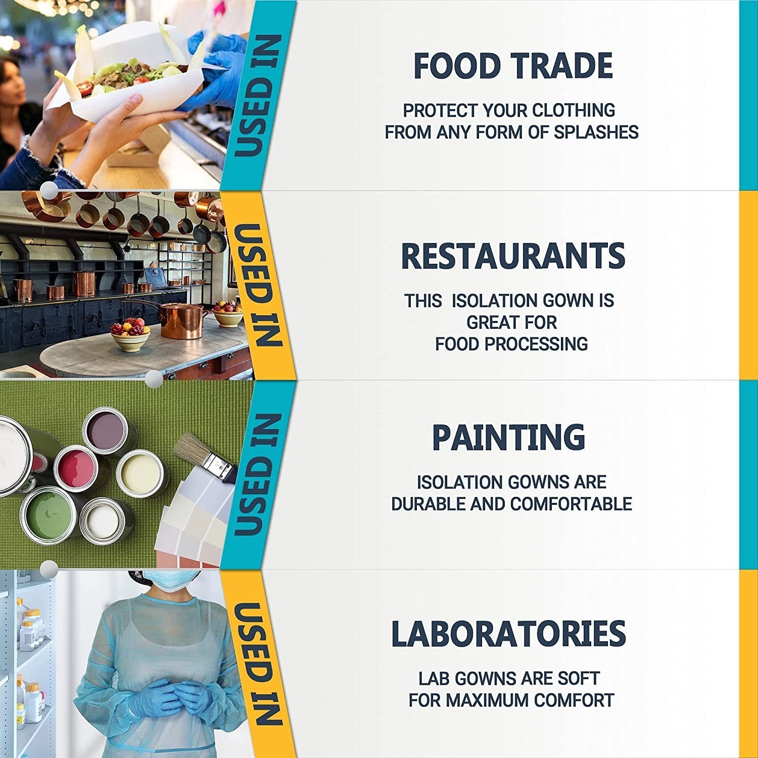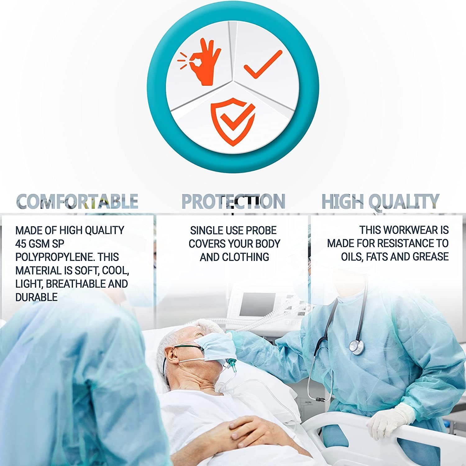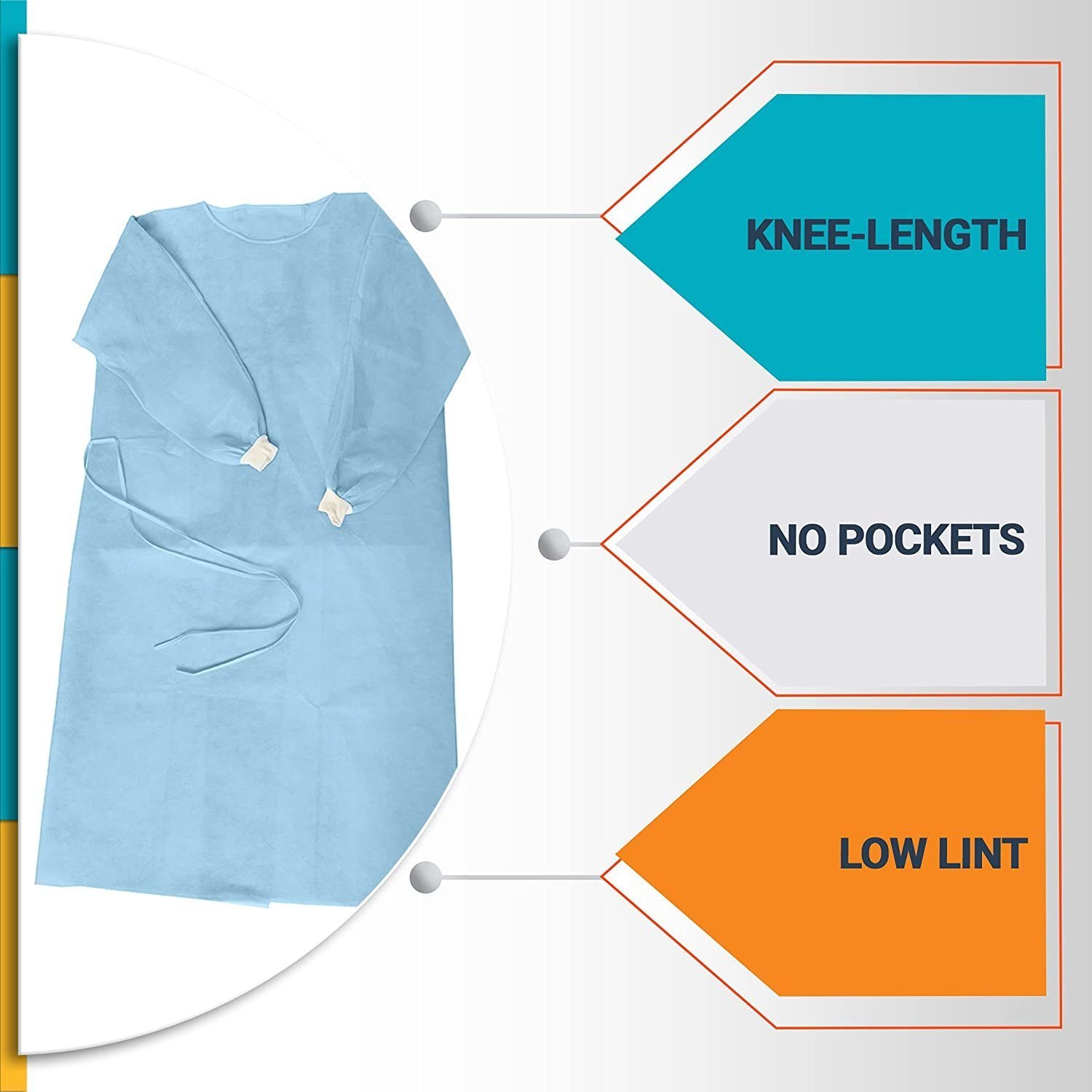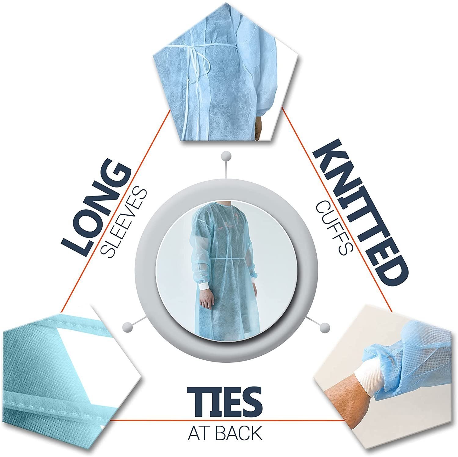 Disposable Isolation Gown Regular; Pack of 50 Blue Disposable Gowns with Sleeves; Knitted Cuffs; Back Ties; Low-Lint SPP 45 gsm Disposable Isolation Gowns; Unisex Protective Gown Disposable