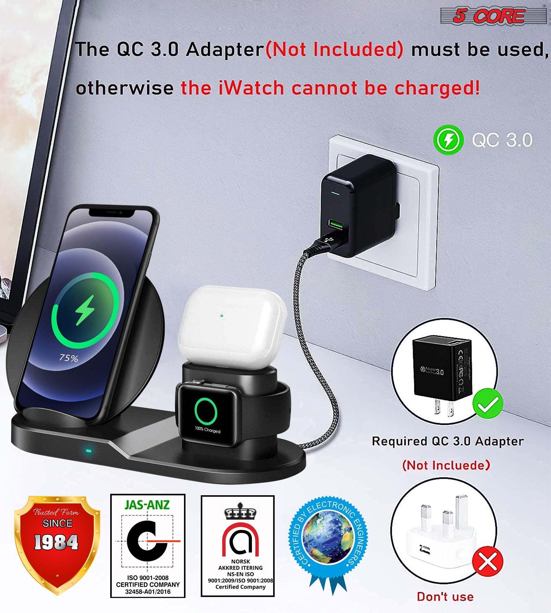 3 in 1 wireless charger station for Apple; Samsung & more: 5 Core's fast wireless charger station charges iPhone; Apple Watch; and AirPods at once; with hybrid charging support for Apple and Android devices.